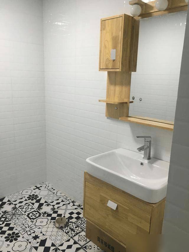 再看卫生间其他细节,原木风的洗漱台配黑白花砖,耐看又不花哨。